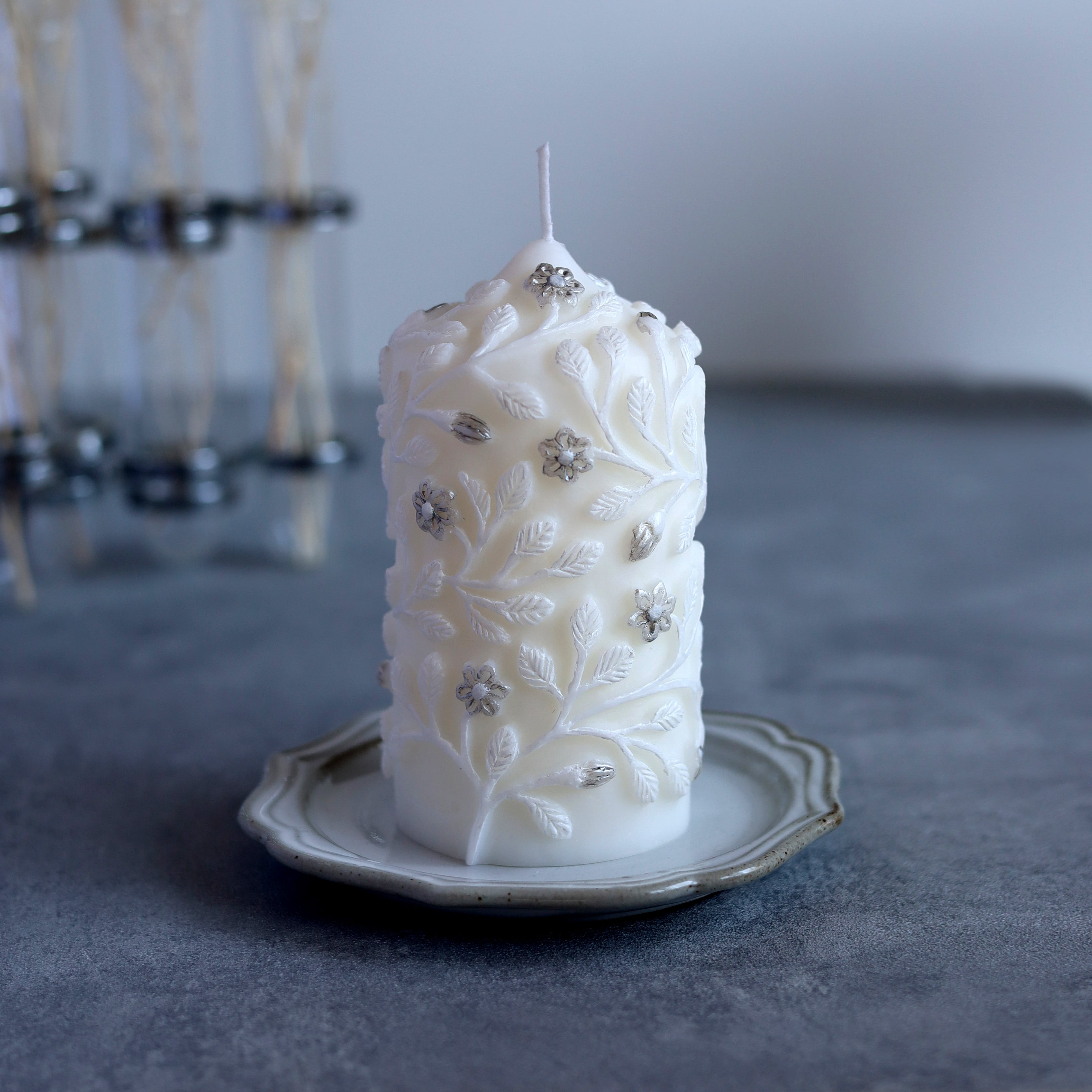 ホワイトベースのキャンドルに、配色はホワイト、シルバーです。