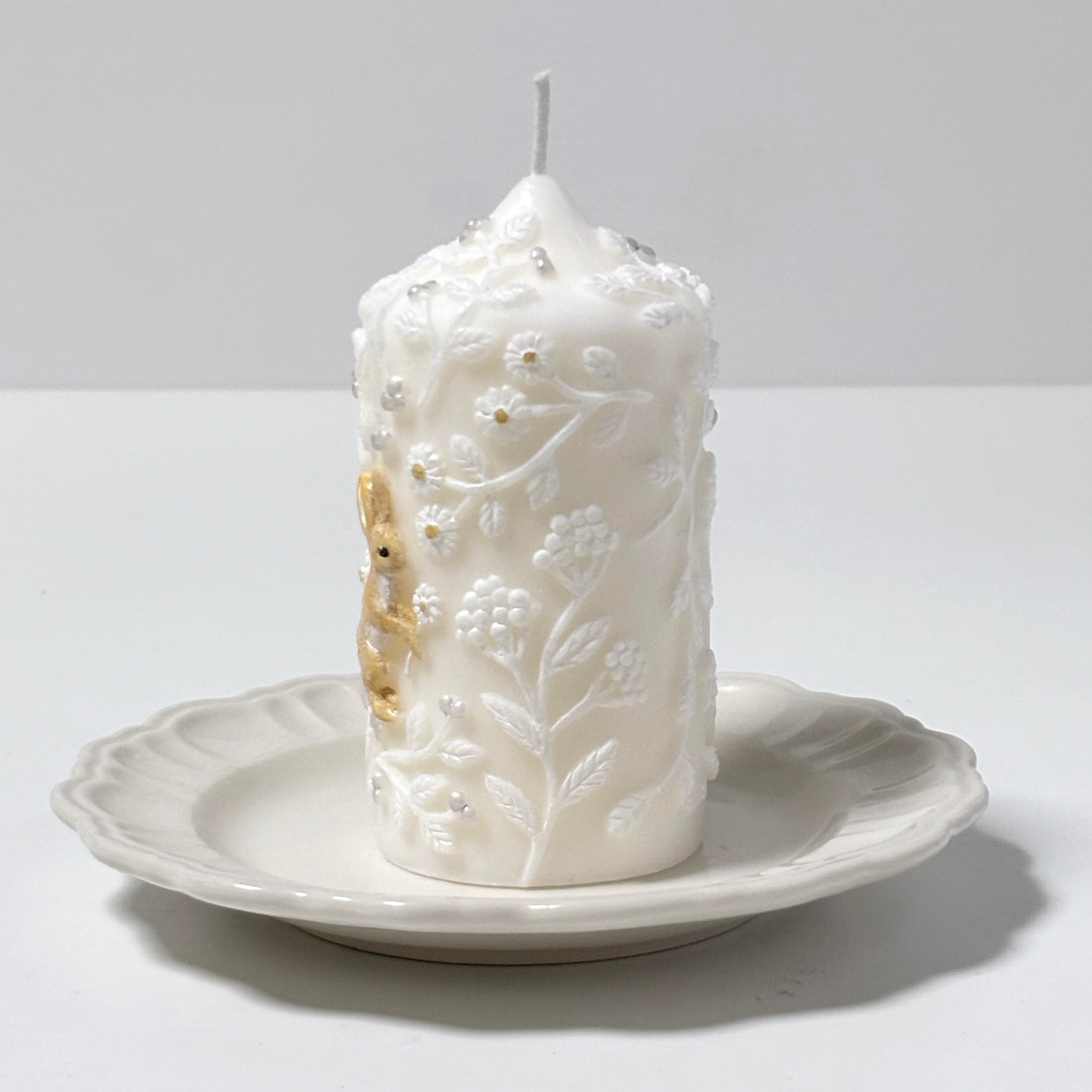 繊細な植物とかわいいうさぎのレリーフを施したキャンドルです。