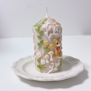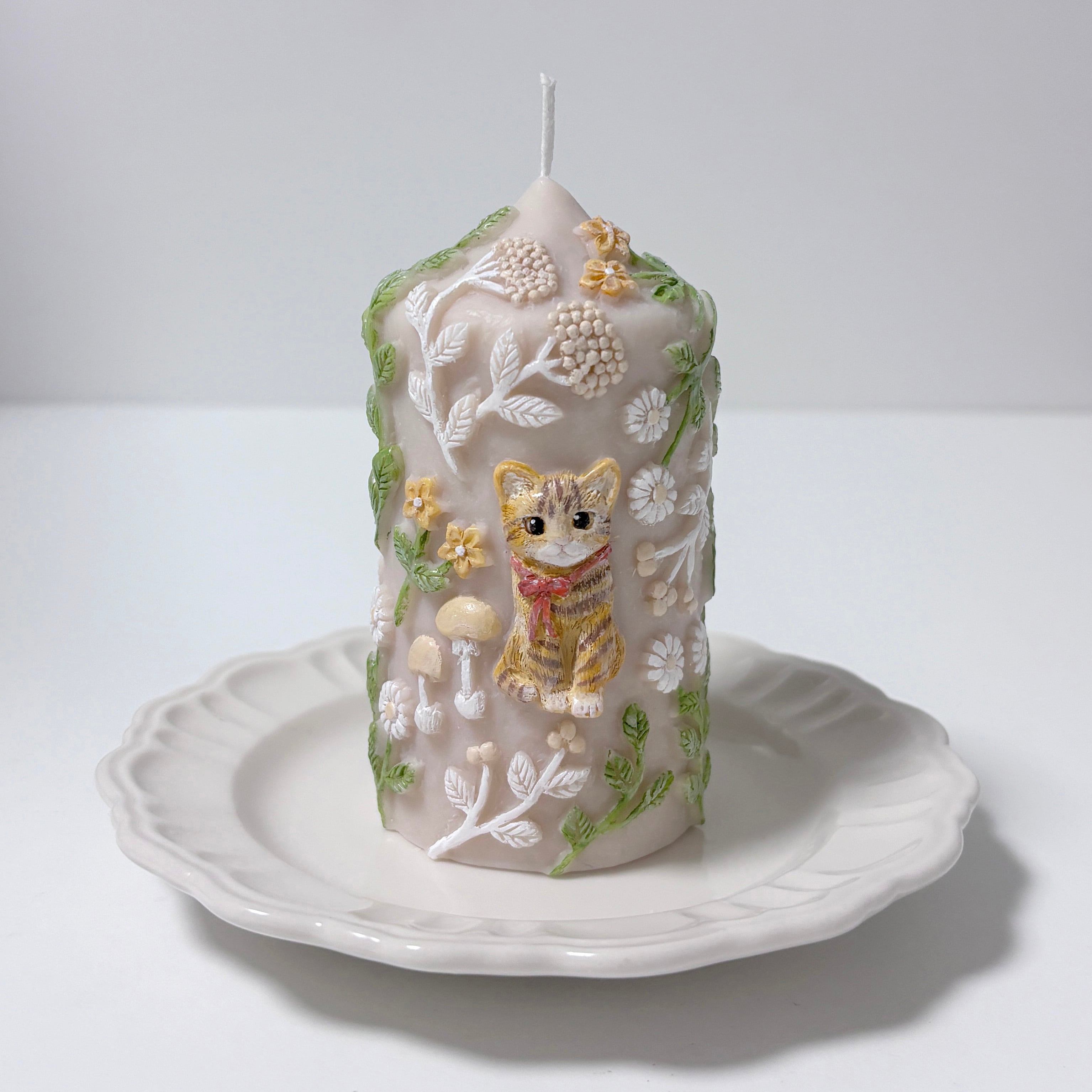 花や植物に囲まれて心から幸福を感じる猫のキャンドルです。