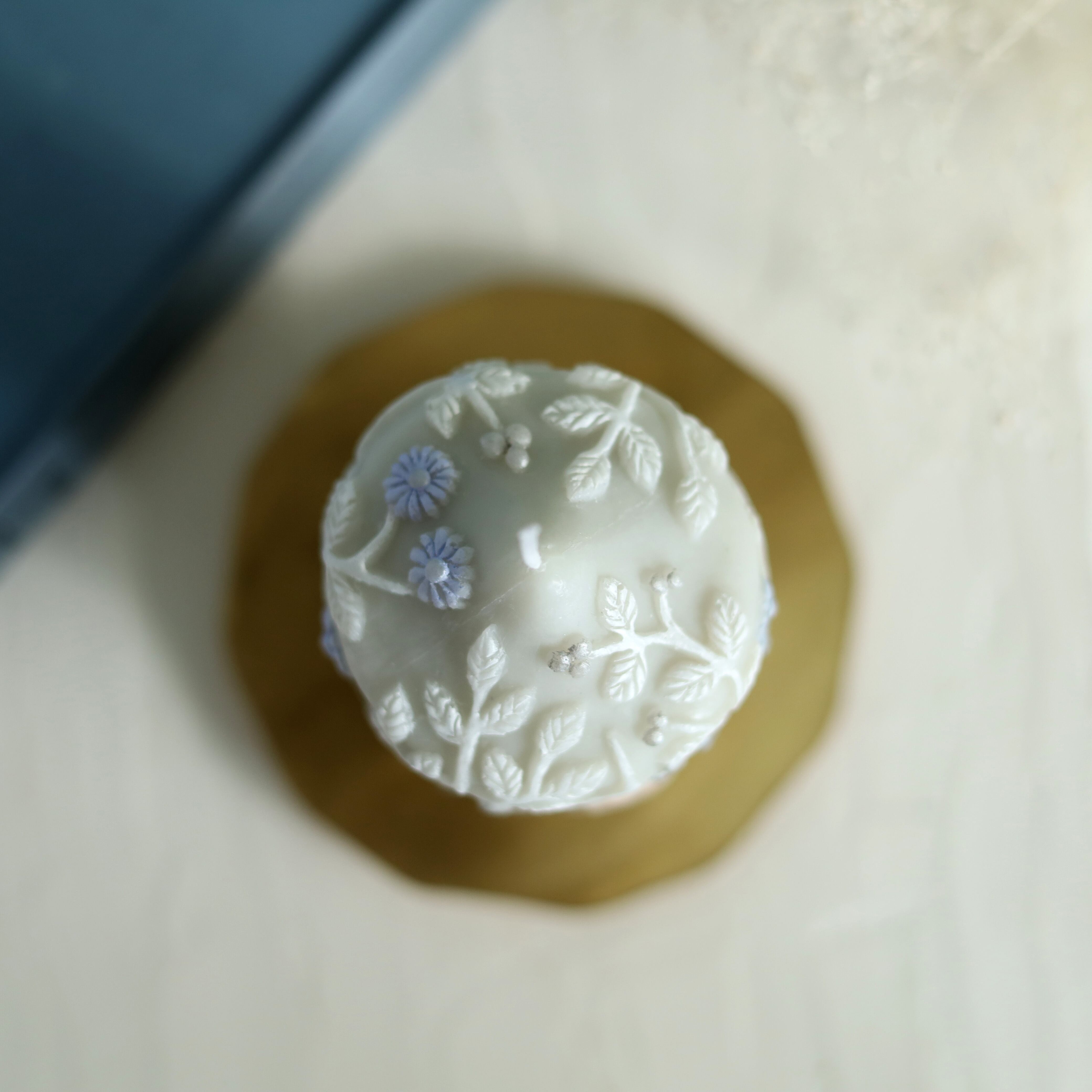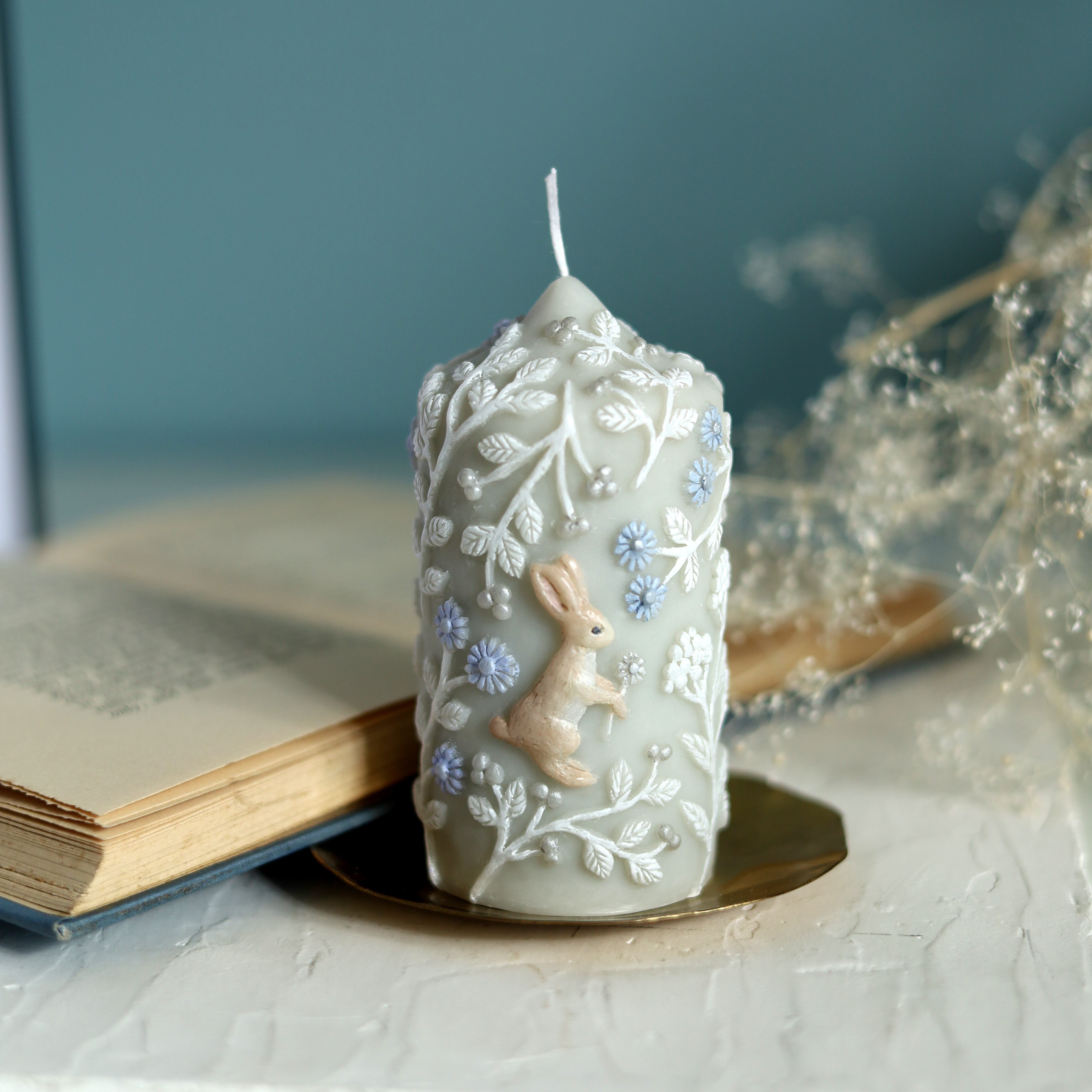 繊細な植物とかわいいうさぎのレリーフを施したキャンドルです